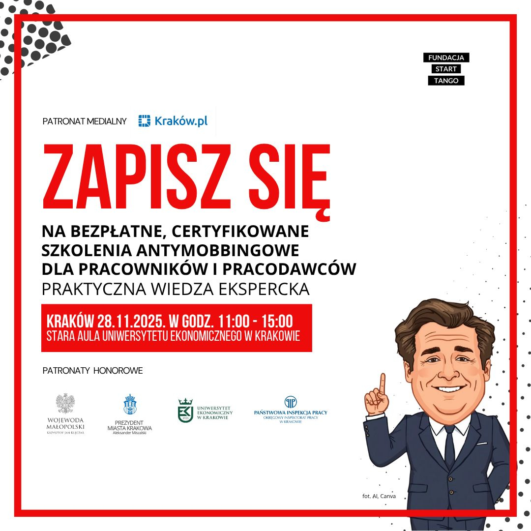28 listopada 2025 r. o godz. 11.00 Fundacja Start Tango oraz Uniwersytet Ekonomiczny w Krakowie zapraszają pracowników do wzięcia udziału w bezpłatnym szkoleniu, realizowanym w ramach konferencji: „Jak tworzyć miejsca pracy wolne od przemocy”.