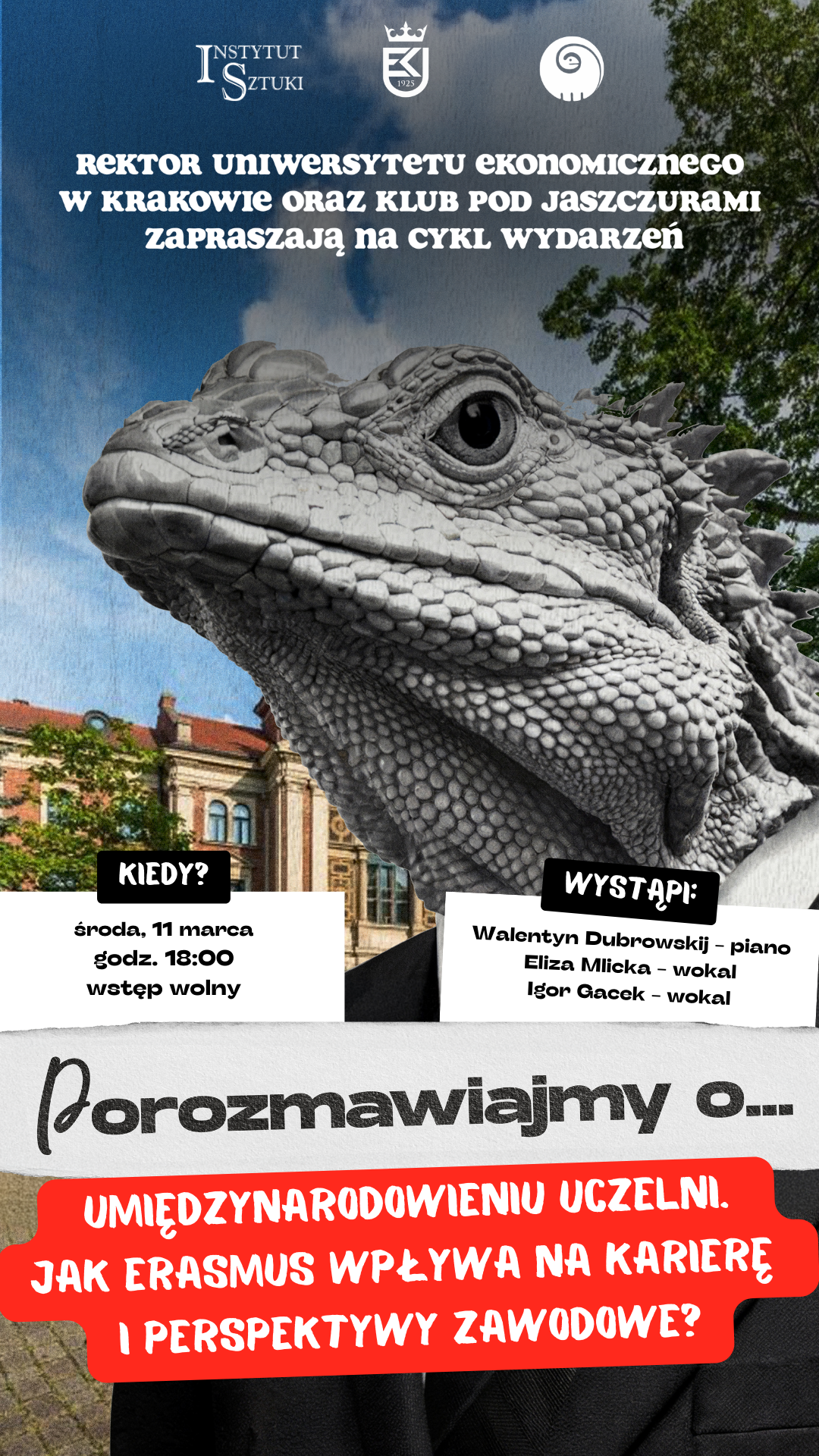 Serdecznie zapraszamy do wzięcia udziału w spotkaniu z cyklu „Porozmawiajmy o…”, organizowanym w ramach programu „UEK Odpowiedzialny. Aktywność Obywatelska” przez Uniwersytet Ekonomiczny w Krakowie, Instytut Sztuki oraz Klub Pod Jaszczurami. Debata pt. „Porozmawiajmy o... umiędzynarodowieniu uczelni. Jak Erasmus wpływa na karierę i perspektywy zawodowe?” odbędzie się w Klubie Pod Jaszczurami (Rynek Główny 8) 11 marca (środa) o godz. 18:00.