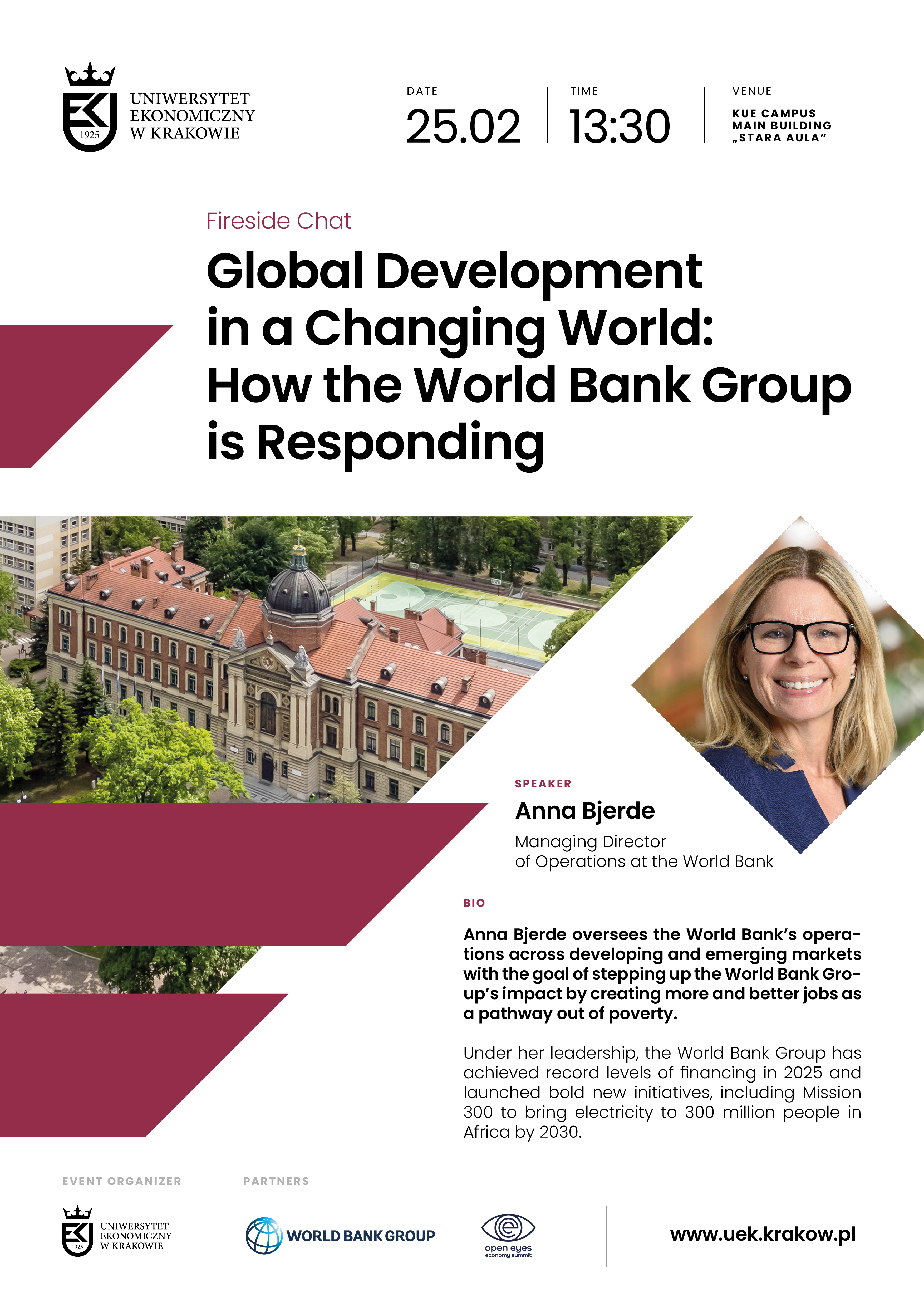 Dyskusja, skoncentrowana wokół tematu: Global Development in a Changing World: How the World Bank Group is Responding, odbędzie się w środę, 25 lutego 2026 r. o godz. 13:30 w Starej Auli Budynku Głównego UEK.