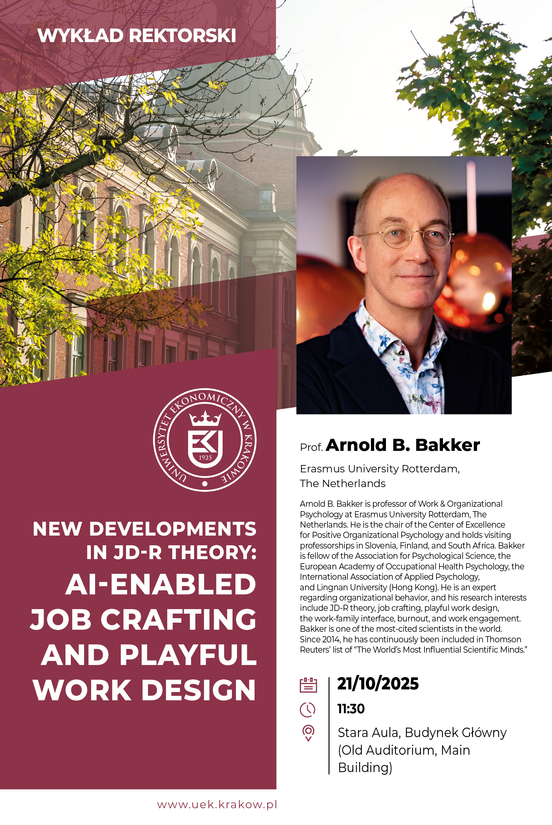 Spotkanie odbędzie się 21 października 2025 r. o godz. 11:30 w Starej Auli, w Budynku Głównym UEK. Wykład pt. New Developments in JD-R Theory: AI-Enabled Job Crafting and Playful Work Design wygłoszony zostanie w języku angielskim.