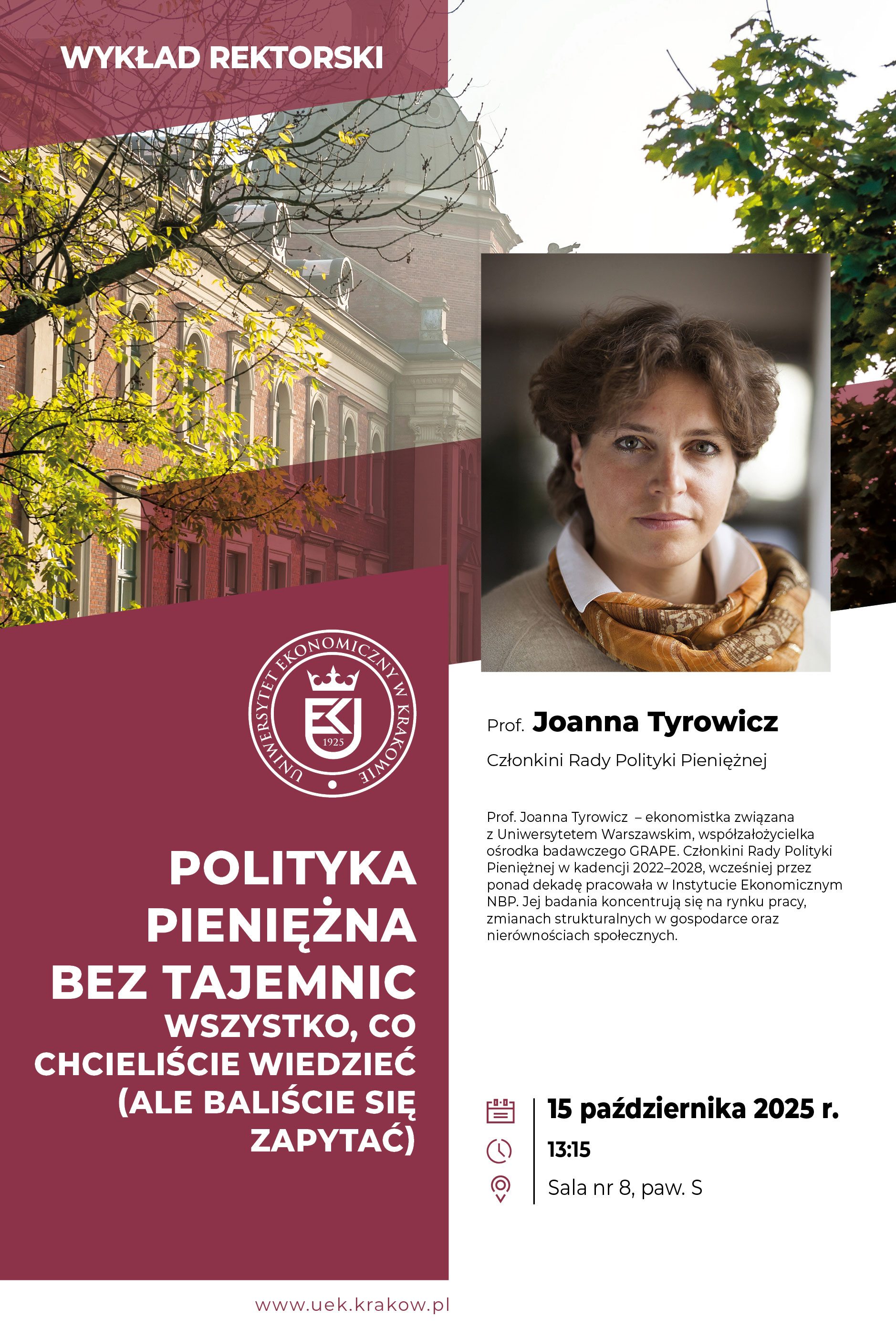 Wykład pt. „Polityka pieniężna bez tajemnic: wszystko, co chcieliście wiedzieć (ale baliście się zapytać)” wygłosi prof. Joanna Tyrowicz, członkini Rady Polityki Pieniężnej.