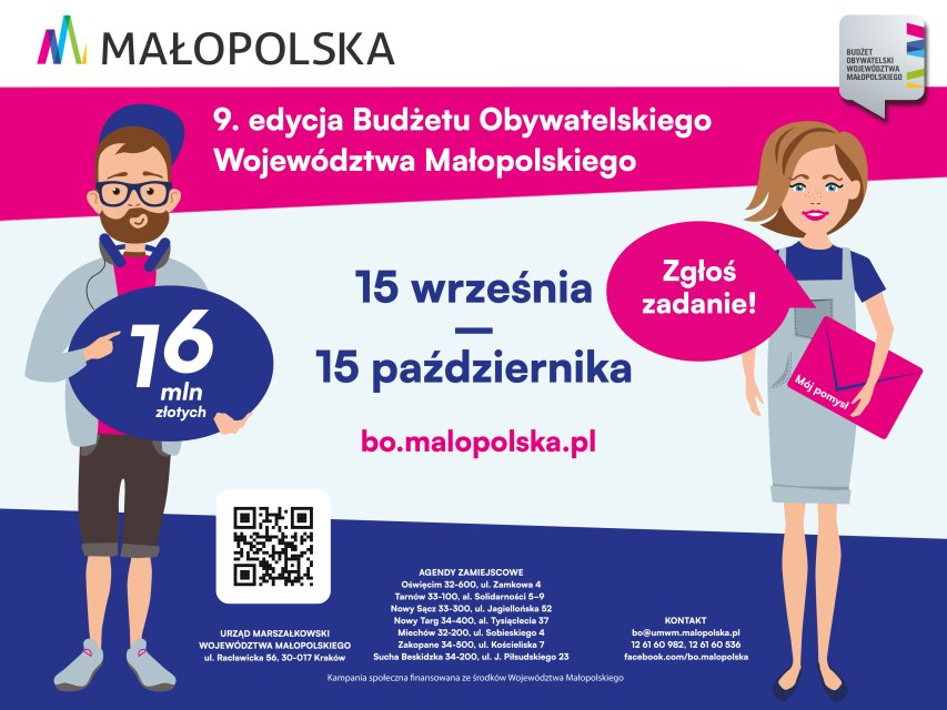 Od 15 września do 15 października 2025 r. trwa nabór zadań do 9. edycji Budżetu Obywatelskiego Województwa Małopolskiego. Wystarczy pomysł oraz 30 podpisów na liście poparcia! Weź sprawy w swoje ręce! 16 mln złotych czeka na Wasze pomysły!