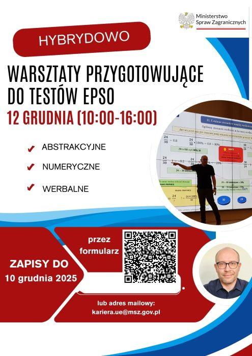 Zapraszamy do udziału w ostatnich w tym roku warsztatach przygotowujących do konkursów EPSO, organizowanych przez Ministerstwo Spraw Zagranicznych. Spotkanie odbędzie się 12 grudnia 2025 r. w Akademii Dyplomatycznej MSZ, ul. Podwale 7 w Warszawie.Można w nich wziąć udział również on-line.